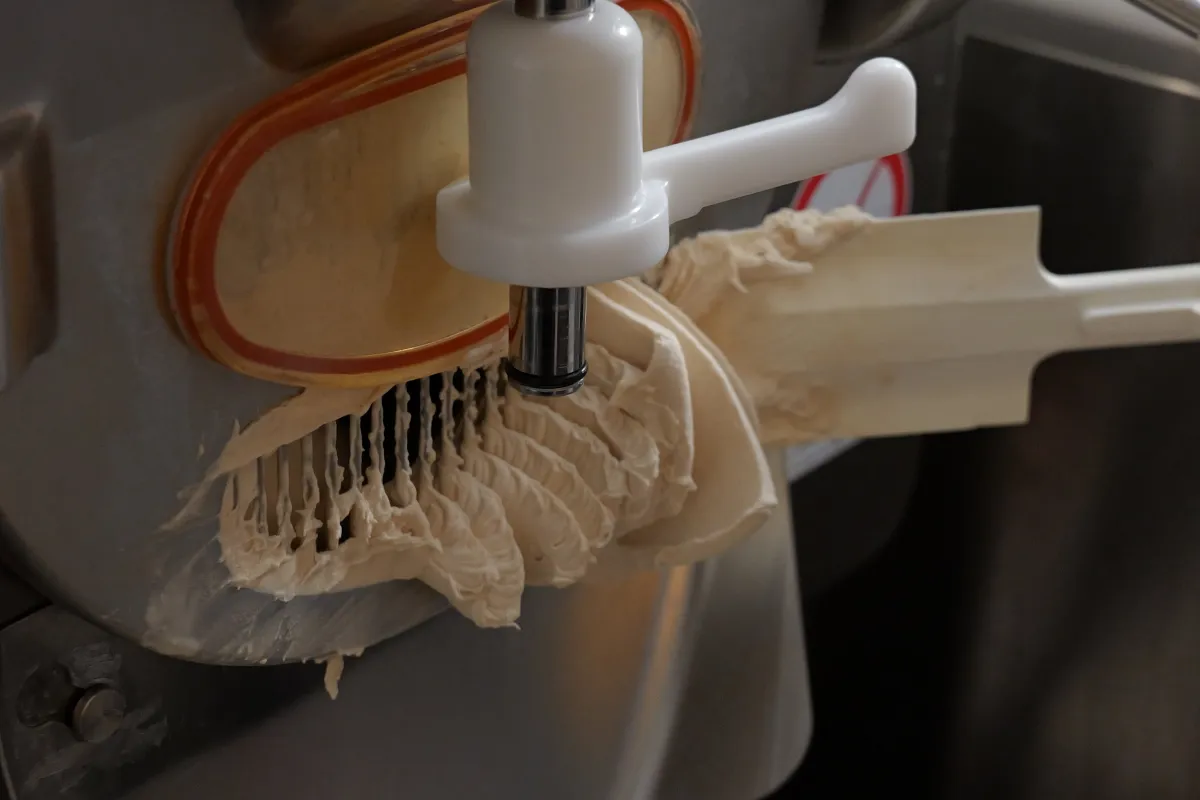 「Gelato Kitchen NOA」の魅力は、何と言ってもその製法にあります。すべてのジェラートは、NOA COFFEEの地下に設けられた専用工房で作られています。こちらでは、イタリアの老舗メーカー「カルピジャーニ」社製のジェラートマシンを使用。これにより、空気を含ませるバランスや温度管理が精密に行われ、なめらかな口どけと素材の味わいが最大限に引き出されています。