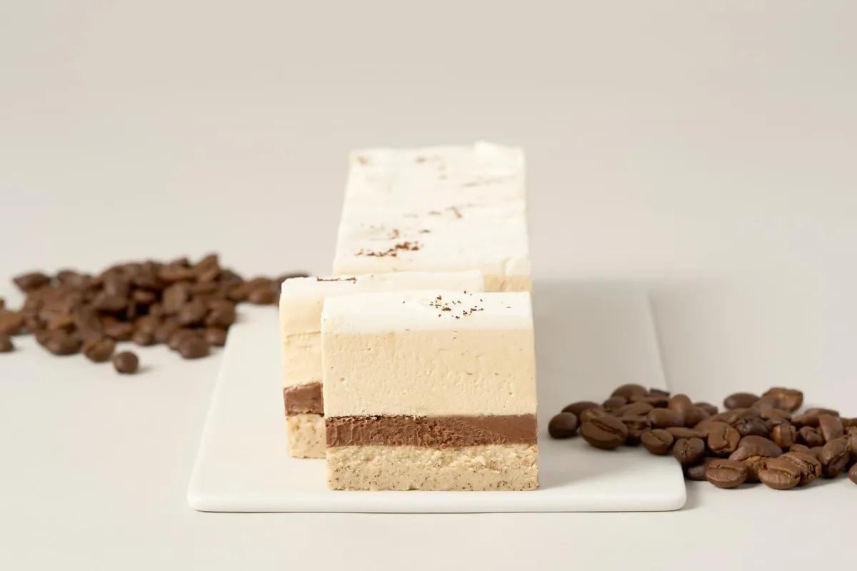 最後の層は、ホワイトチョコレートのまろやかさとコーヒー粉のほろ苦さが相まった生ガトーショコラ。上部にはエスプレッソが塗られており、食べるとコーヒーの香りが最後にふわっと広がります。