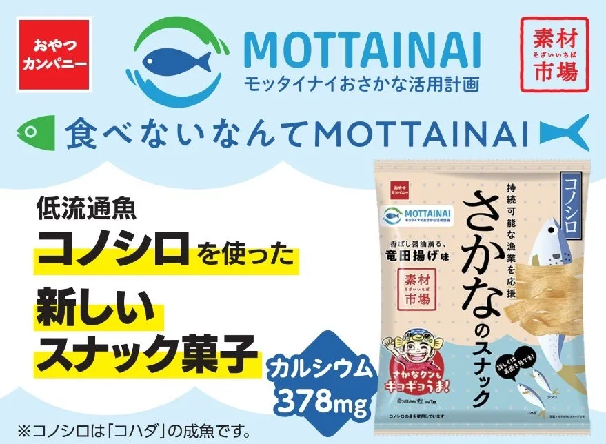 三重県津市に本社を置く株式会社おやつカンパニーは、新たなプロジェクト「モッタイナイおさかな活用計画」を立ち上げました。このプロジェクトでは、流通量が少なく、知られざる魚を活用した商品を展開することで、持続可能な漁業を支援します。本企画の初商品として、2025年10月27日(月)に、低流通魚の一つ「コノシロ」を使用したスナック「素材市場さかなのスナック(コノシロ香ばし醤油薫る、竜田揚げ味)」が登場します。