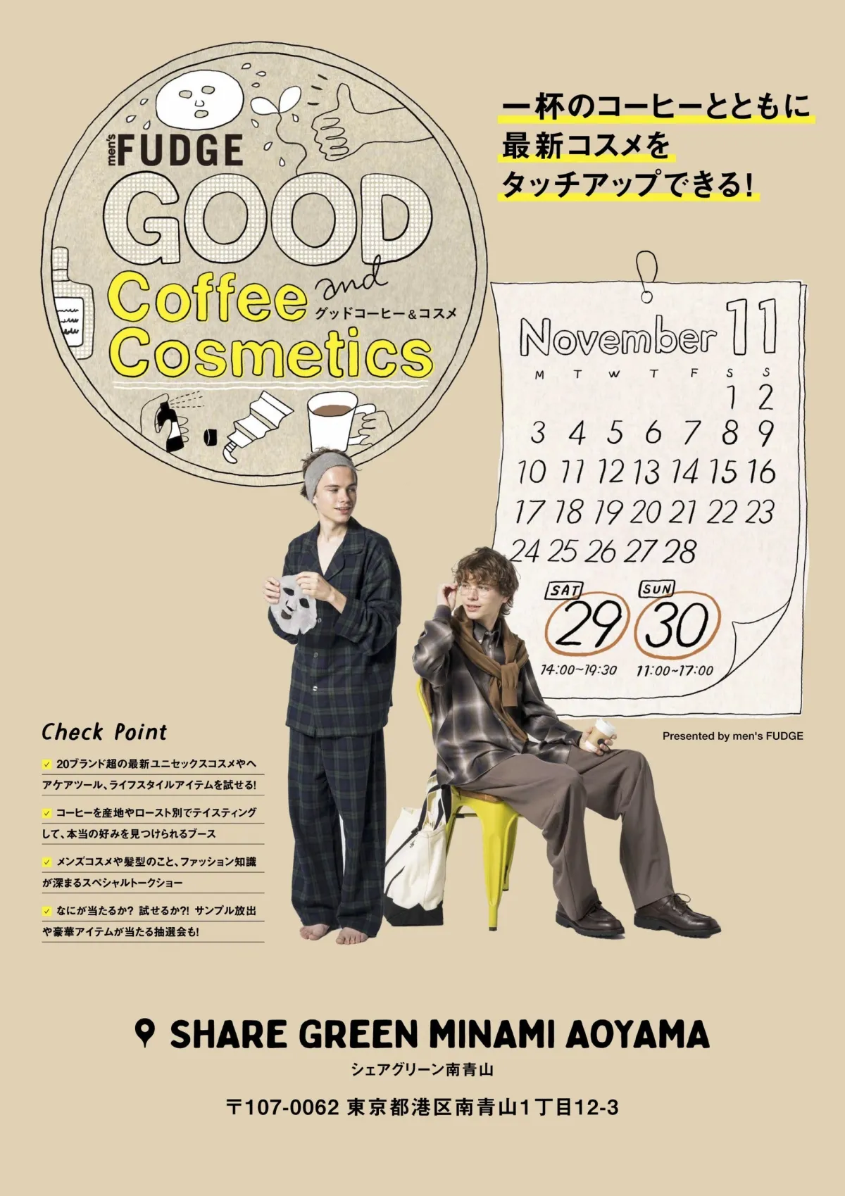 2025年11月29日(土)と30日(日)の二日間、東京・南青山にて新たなイベント、「GOOD Coffee & Cosmetics」が開催されます。このイベントは、メンズファッション&カルチャー雑誌『men’s FUDGE』が主催し、初めての単独イベントとなります。コーヒーとコスメというユニークなテーマのもと、来場者はリラックスした雰囲気の中、厳選されたメンズコスメを自由に試せる貴重な体験を楽しむことができます。
