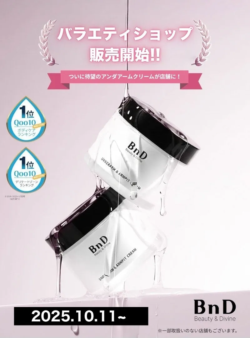 10月11日(土)から全国のバラエティショップで『BnDアンダーアームクリーム』が販売されます。また、一部の店舗では取り扱いがない場合もありますので、事前にご確認ください。
