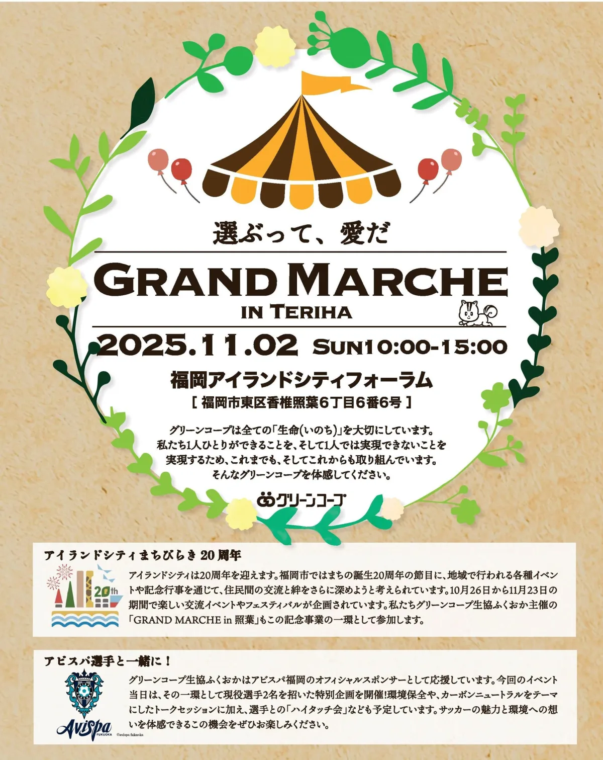 2025年11月2日(日)、福岡市東区のアイランドシティフォーラムにて、地域住民や来街者が楽しむマルシェ「Grand Marche in Teriha」が開催されます。このイベントは、アイランドシティのまちびらき20周年を祝うものとして行われ、入場は無料で楽しめます。