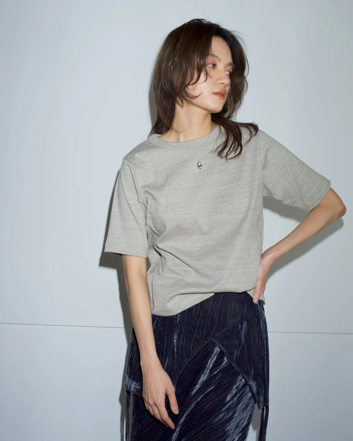 このTシャツは、後ろが大胆に開いているデザインがポイントで、女性らしさを強調しています。細めの五分袖とややゆったりとしたシルエットで、カジュアルだけれども上品な印象を与えてくれます。