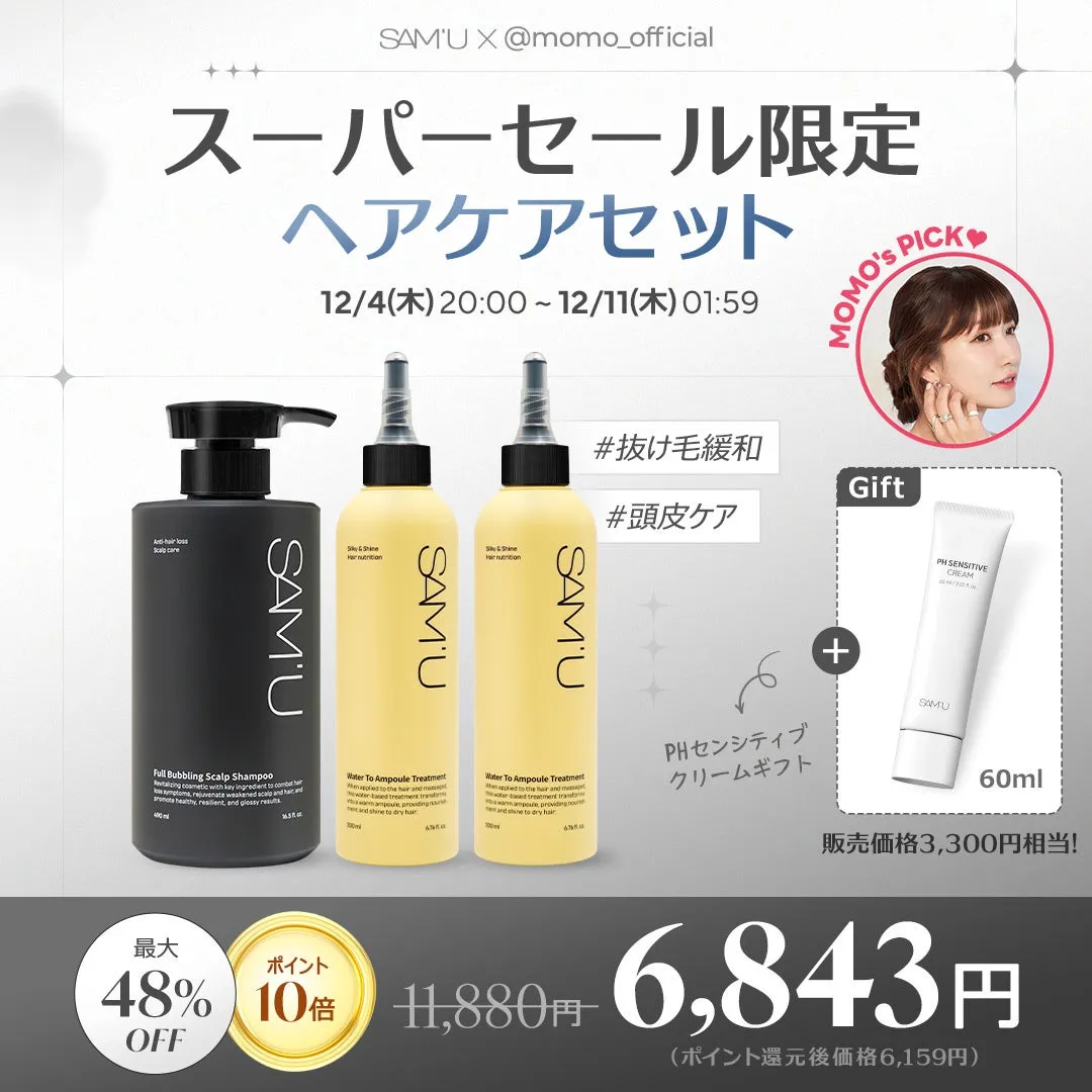 特に注目すべきはMOKYUHとのコラボセットです。このセットには、フルバブリングスカルプシャンプーとウォータートゥーアンプルトリートメントの2個が含まれ、希望小売価格は11,880円ですが、スーパーセールではなんと6,843円(割引率48%)で購入可能。また、購入者にはPHセンシティブクリーム(60ml)もプレゼントされるため、実質のお得感が際立ちます。