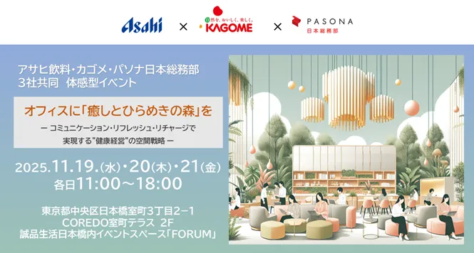 2025年11月19日(水)から21日(金)まで、東京・日本橋で「オフィスに『癒しとひらめきの森』を」と題した体験型イベントが開催されます。このイベントは、カゴメ株式会社、パソナ日本総務部、そしてアサヒ飲料株式会社の三社が協力して行うもので、参加者には新しい職場環境の可能性を体感していただけます。