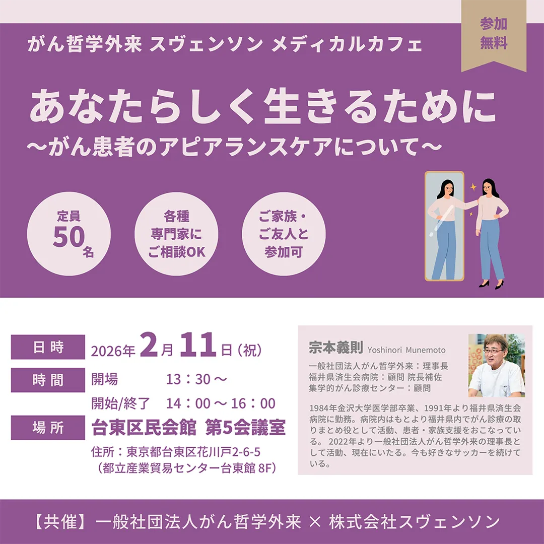 あなたの心と体のケアをサポートする株式会社スヴェンソンが、がん患者やその家族のための特別なイベント「がん哲学外来 スヴェンソン メディカルカフェ」を開催します。このメディカルカフェは、2026年2月11日の祝日に台東区民会館で行われ、「あなたらしく生きるために」をテーマにしています。