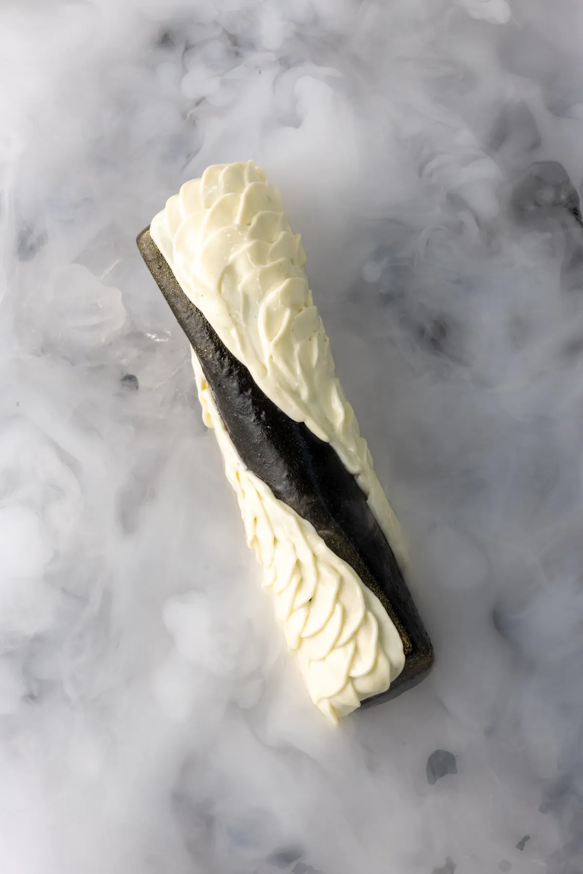 「ブッシュ・ド・ノエル」とは、クリスマスを祝うために作られるフランスの伝統的なスイーツで、特にこのレストランが手がけるものは例外的です。今年のデザインは、黒と白のドレスのような美しさを持ちながらも、モダンでエレガントな印象を与えています。この美しいスイーツは、特別に選ばれた「ル・ショコラ・アラン・デュカス」のショコラを使用して作られたフィヤンティーヌを基に、芳醇なバニラのビスキュイ、甘酸っぱさが特徴の苺のマルムラードを重ねています。