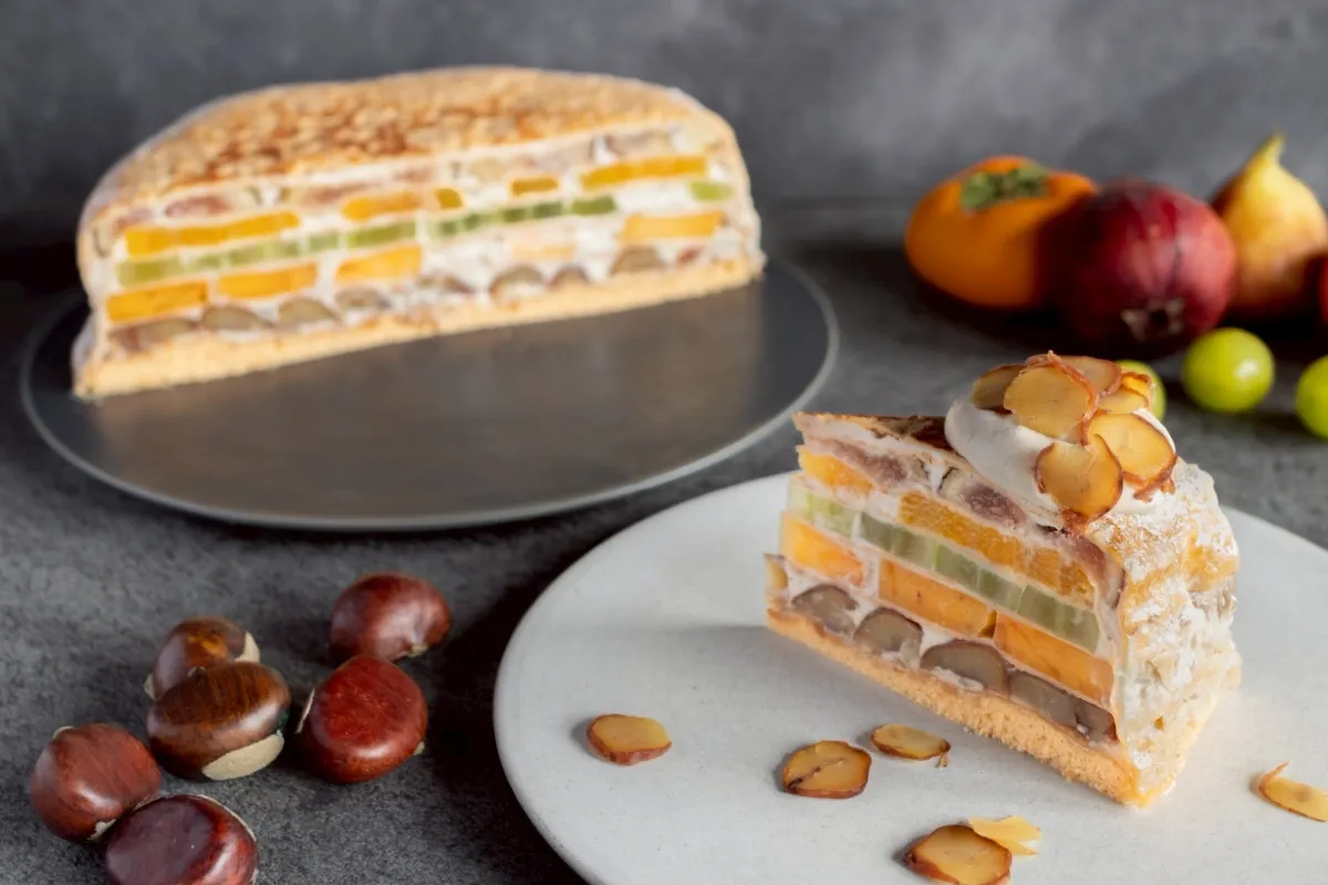 ミルクレープの中には、なめらかな丹波くりのクリームがたっぷり詰まっており、今月は柿、シャインマスカット、早生みかん、いちじくといった旬の果物が使用されています。これらの果物の瑞々しさと甘酸っぱさが、丹波くりの奥深い甘みと芳醇な香りと見事に調和します。ひと口食べるごとに、幸せな気分に包まれることでしょう。