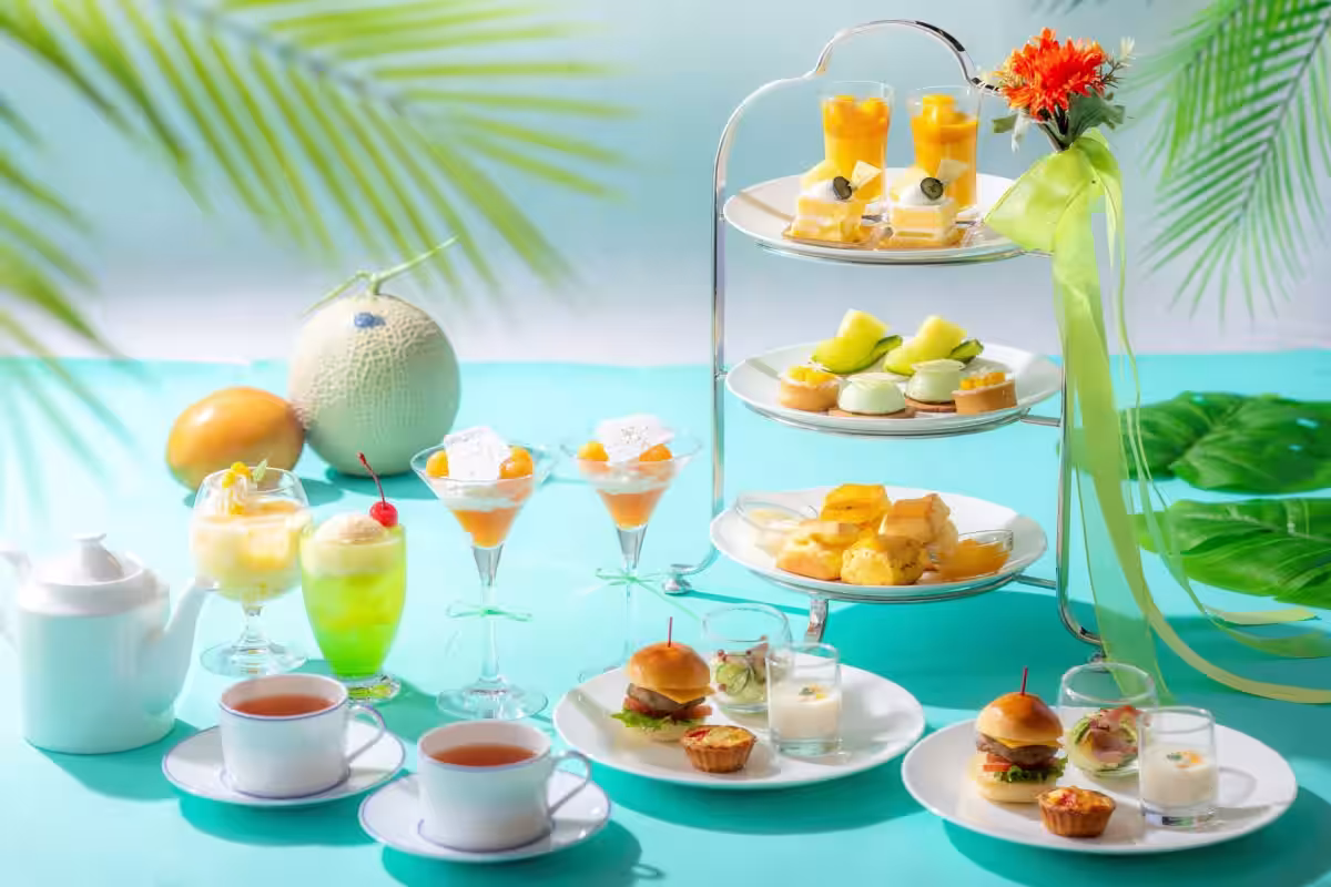 このアフタヌーンティーセットでは、神戸ポートピアホテルの熟練したパティシエによる特製スイーツが用意されています。特徴的なのは、“果物の王様”と称される静岡県産のクラウンメロンと、太陽の光そのもののように輝く宮崎マンゴーをふんだんに使用している点です。この季節にぴったりなフルーツに、心を奪われること間違いなしです。