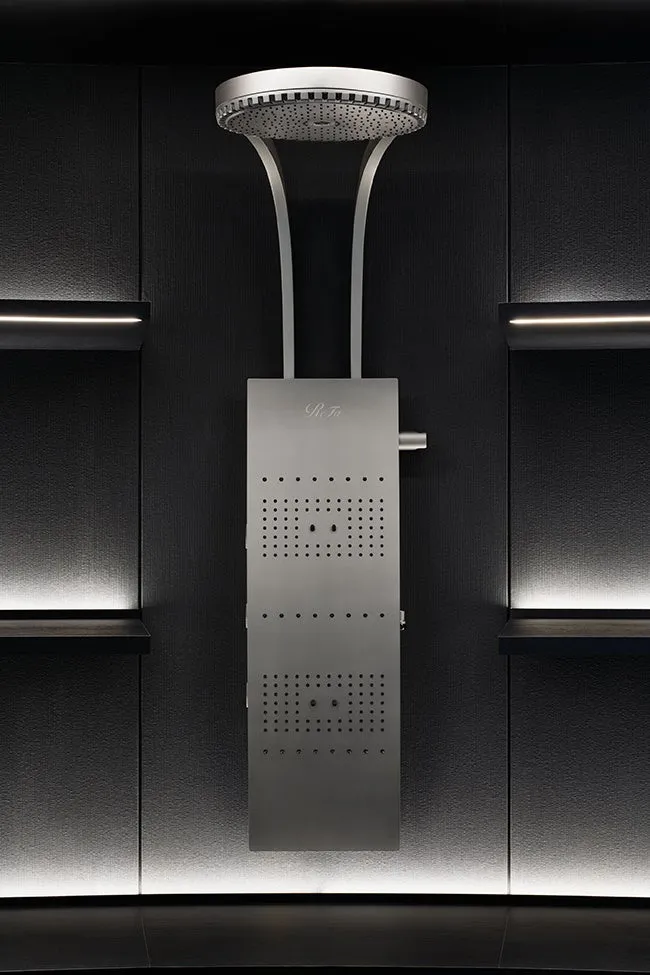 このオーバーヘッドシャワーの特筆すべき点は、緻密な設計によるファインバブルの発生と、豪華なスケール感の融合。これまでにない入浴体験を提供し、重厚感と洗練されたデザインが浴室に優雅な雰囲気を与えます。特に、空間に調和するその造形は、家の中のひとつのラグジュアリーとしても機能します。