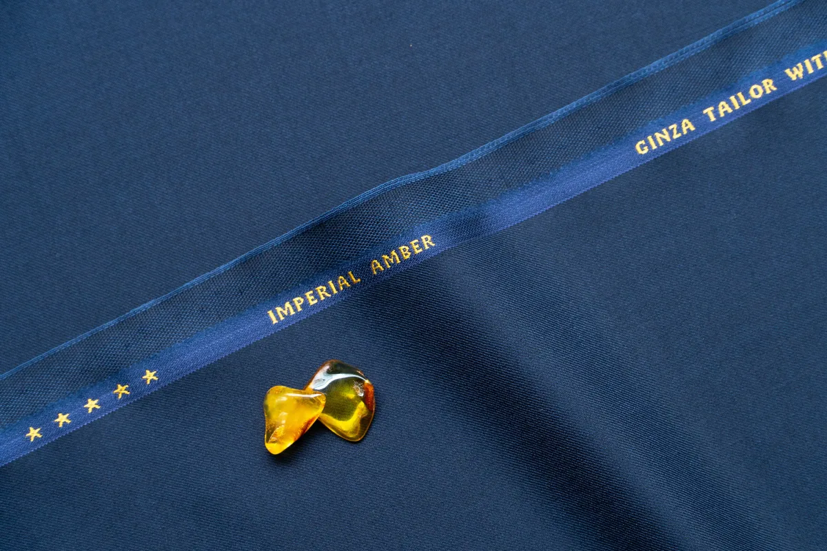 「IMPERIAL AMBER」という名称の由来は、英語で琥珀を意味する「AMBER」から来ています。これは、天然琥珀を細かく砕いて布地に織り込んだことを反映しています。琥珀は古来から「繁栄」や「安定」を象徴するものとされ、ファッションの世界でもその美しさとエネルギーは特別な存在です。
