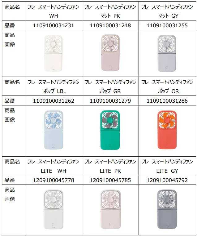 回収対象となるのは2025年製のフレ スマートハンディファン。具体的な製造ロット番号は以下のとおりです: