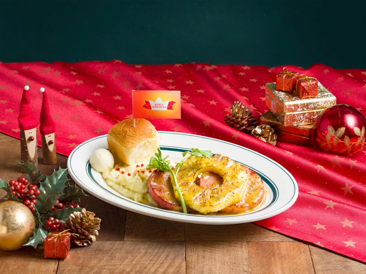 今回、登場するメニューは『クリスマス ハワイアン ハムステーキ with KING'S HAWAIIAN』。こんがりと焼きあげた厚切りのハムの上には、甘酸っぱいパイナップルが添えられ、さらにハニーマスタードソースがかけられます。これに、KING'S HAWAIIANのオリジナルハワイアンスウィートロールが組み合わさることで、ハワイの伝統的なホリデーメニューの味覚を楽しむことができます。製品の価格は、1,890円(税込2,079円)で、テイクアウトも可能です。