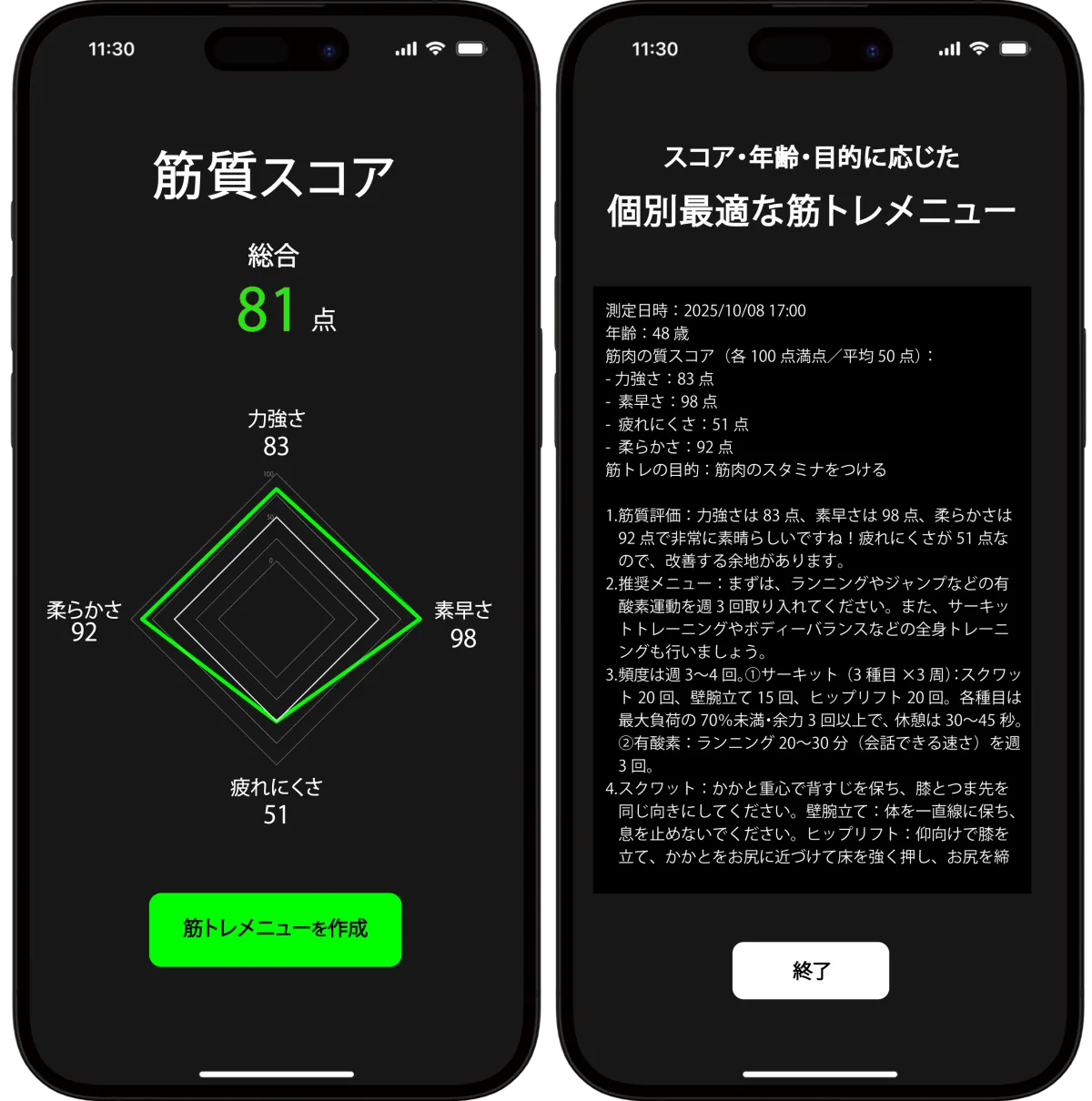 さらに、「筋肉Phone」は、年齢や目的に応じて個別に最適な筋トレメニューを自動生成します。たとえば、筋力アップを目指すのか、スタミナを増やすのか、それぞれの目標に合わせて、種目、強度、回数、セット、休息、頻度といった細かなプランを提案します。これにより、より効果的かつ効率的なトレーニングが可能となります。