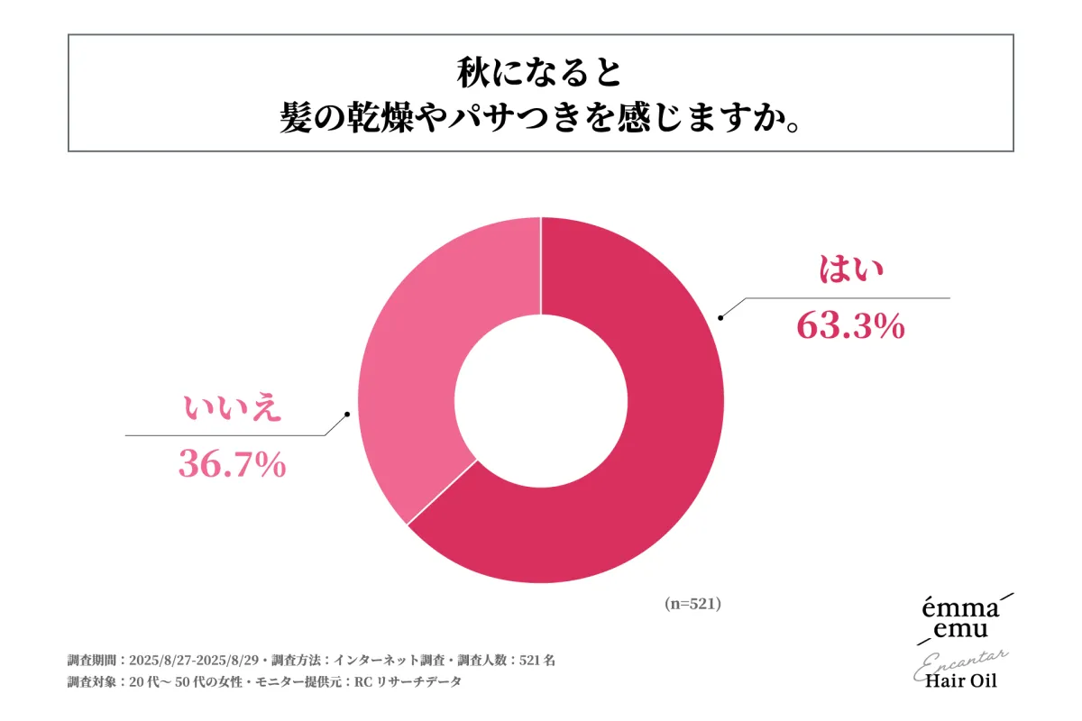 今回の調査によると、63.3%の女性が秋になると髪の乾燥やパサつきを感じると回答しました。多くの人が、この季節特有の髪の悩みを抱えていることがわかります。特に、季節の変わり目は外的要因が多岐にわたるため、髪のケアが軽視されがちです。