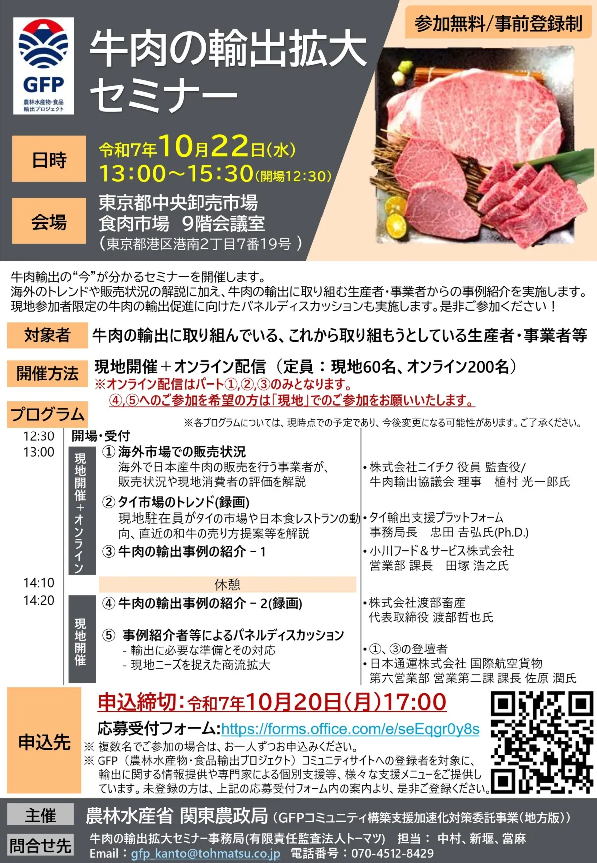 このセミナーでは、海外に向けた日本産牛肉の販売状況や輸出事例のプレゼンテーション、そして参加者同士によるパネルディスカッションが行われる予定です。
