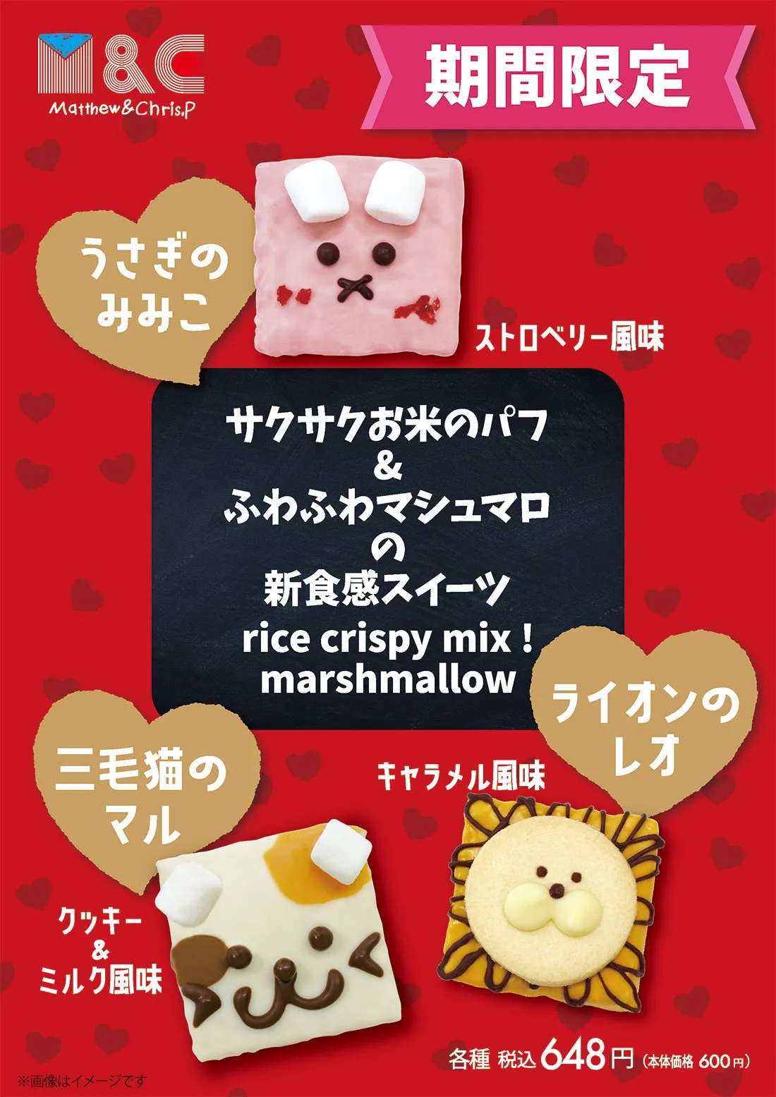 「マシュー&クリスピー」と名付けられたおこしケーキは、お米をシリアルとしてマシュマロと絡めて固めたサクサク食感が特徴です。今年は、三毛猫のマル、ライオンのレオ、うさぎのみみこの3種類が、バレンタインとホワイトデー限定で楽しめます。どのデザインも愛らしいアニマルモチーフで、お菓子を贈る相手の性格や好みに合わせて選ぶ楽しさがあります。