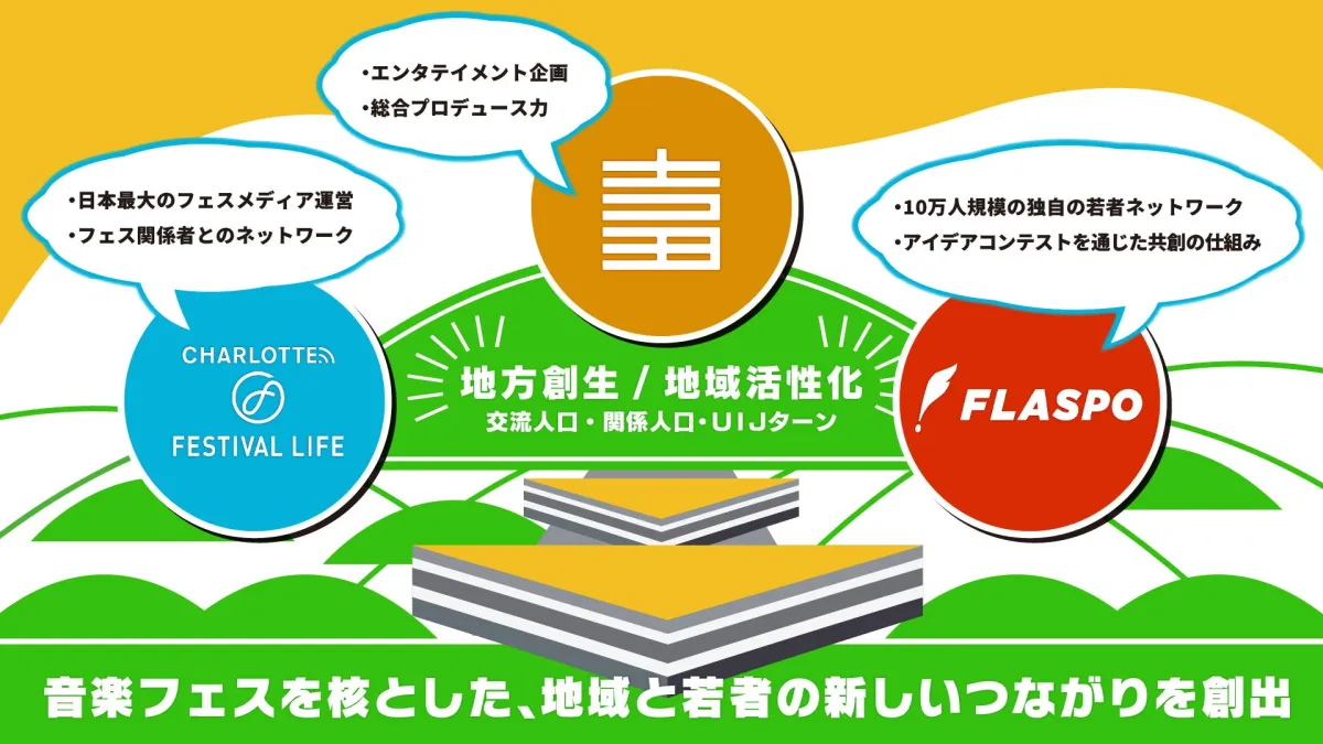 少子高齢化が進み、特に地方では人口減少が著しい状況にあります。この問題を解決するため、「Festival Life」と「FLASPO」、「吉田正樹事務所」の三者が手を組みます。それぞれが持つ強みを結集し、各地域の若者や企業と連携しながら、魅力的な音楽フェスを企画・開催することで、関係人口の創出を促進します。