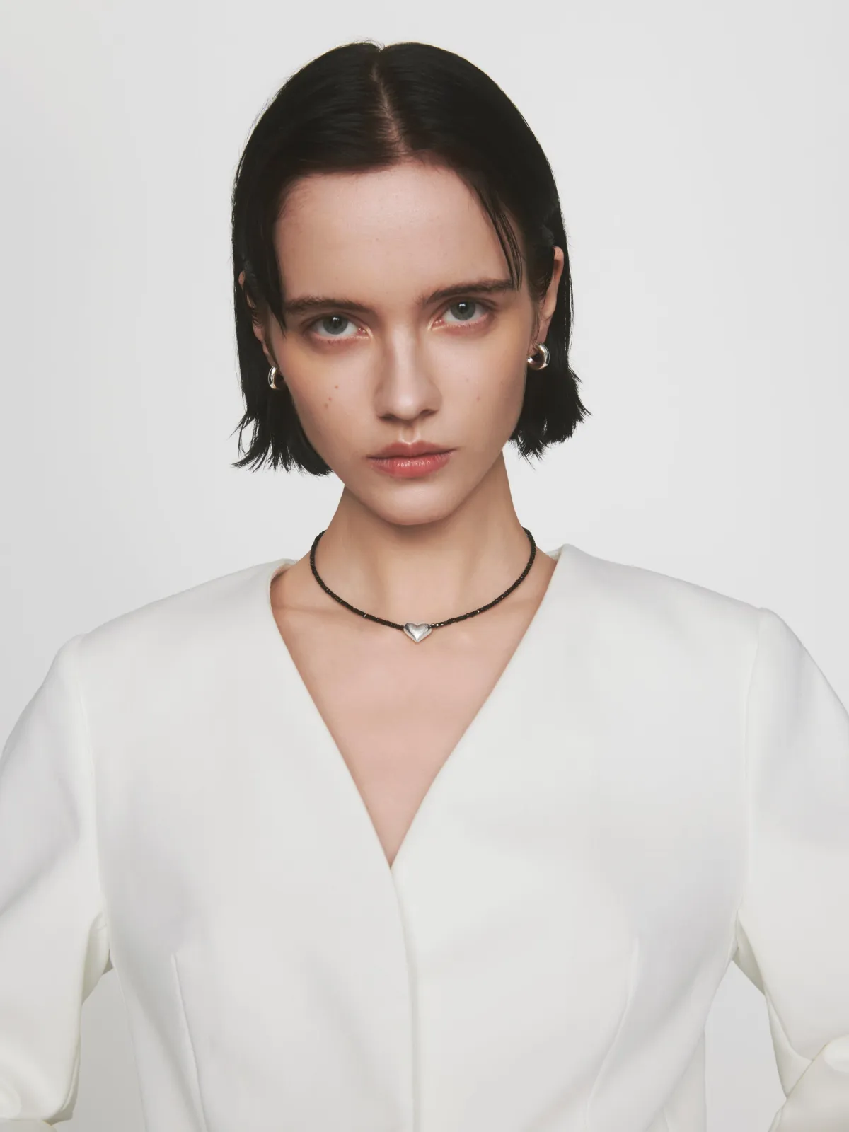 漆黒のブラックスピネルとシルバー925の光沢を組み合わせたハートモチーフのネックレスです。このアイテムは、「魔除けのお守り」としても人気のあるブラックスピネルが、人の目を引きつけます。シンプルなスタイルの中に知的で洗練された印象を与え、特別な場面にもぴったり。