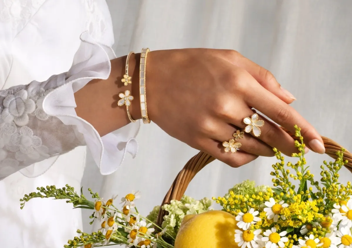 「ジャスミン」コレクションは、洗練された技術と詩的な美しさが融合したデザインが特徴です。花びらを思わせる有機的なフォルムや、マザーオブパールの穏やかで淡い色合いが花の優しさを表現します。また、パヴェダイヤモンドやマットなゴールドベースなど、多様なラインナップが豊富。すべての作品には、ロベルトコインのシグネチャーであるルビーが埋め込まれており、持つ人に幸運をもたらす願いが込められています。