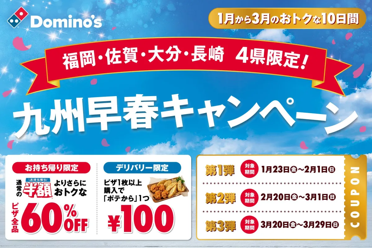 寒い冬が終わりを迎え、待ち遠しい春がやってきます。そんな季節に、ドミノ・ピザが九州地方の皆様に向けて「九州限定早春キャンペーン」をお届けします。このキャンペーンは、福岡県、大分県、佐賀県、長崎県の29店舗で、特別なお得なキャンペーンが楽しめるチャンスです!
