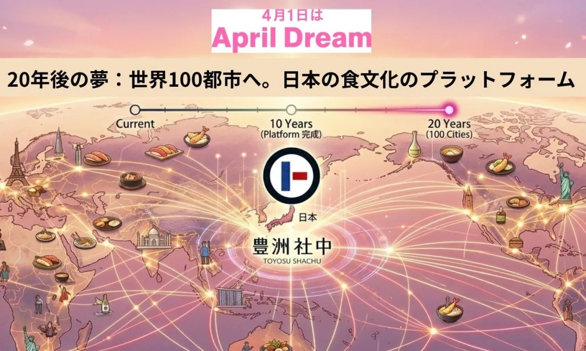 豊洲社中は『April Dream』の趣旨に賛同し、夢の実現に向けて動き出しました。20年後、日本食が世界の食卓で当たり前になる未来。それは、一部の企業に任せるのではなく、すべての志のある人々と共に実現していきます。私たちの挑戦はまだ始まったばかりです。それぞれのプレイヤーが集合し、共に夢を実現する『社中』の力で、世界へ新たな日本の美味を届けていきます。