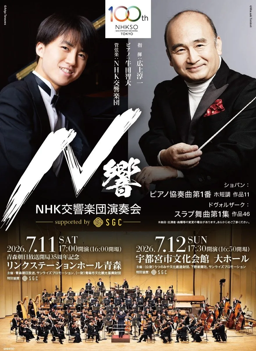 音楽ファンの皆様、お待たせしました!2026年7月、特別な演奏会が青森と栃木で行われます。「NHK交響楽団演奏会 supported by SGC」と題し、世界的に評価されている指揮者の広上淳一氏と、若手ピアニストであり、数々のコンクールで受賞歴を持つ牛田智大氏が共演します。この演奏会は、NHK交響楽団創立100周年を祝う意味合いもあり、大きな期待が寄せられています。
