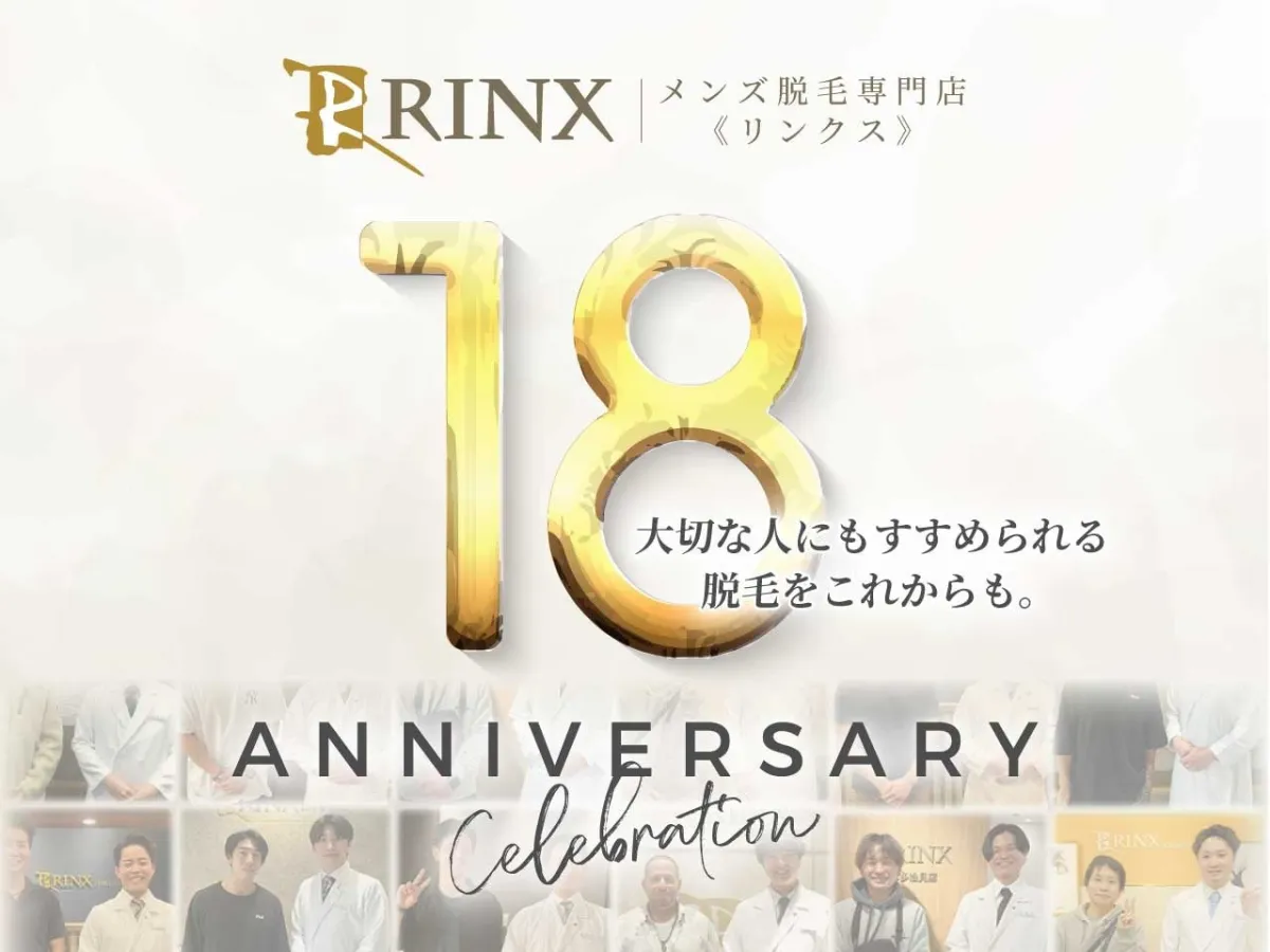 メンズ脱毛専門店RINX(リンクス)は、2008年に神戸で誕生し、2026年3月29日に創業18周年を迎えます。この長い道のりは、顧客の信頼とスタッフの努力、そして多くの関係者の支えによって築かれてきました。脱毛という選択が男性にとって一般的ではなかった時代から現在の多くの選択肢の中で、RINXを選ぶ人が増えているとのことです。皆様への感謝の気持ちを込めて、これからも安心して通える脱毛サービスを提供し続けていきたいと考えています。