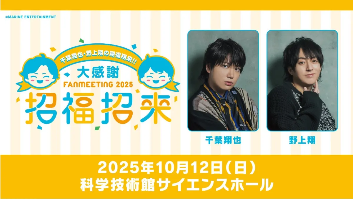 千葉翔也さんと野上翔さんのファンミーティング『翔福翔来!! 大感謝FANMEETING 2025 招福招来』は、心温まる時間と、特別なグッズ、そしてファンとのふれあいが詰まったイベントです。現地参加の方も、オンライン視聴の方も、ぜひお楽しみに!