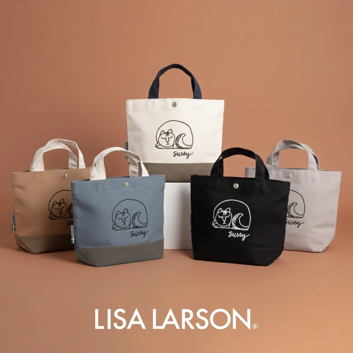 リサ・ラーソンのファン必見!人気キャラクター「スッシー」が大きく刺繍されたミニトートバッグが登場しました。株式会社トンカチから発売されたこのバッグは、デイリー使いにぴったりなアイテムです。サイズはA5ノートがすっぽりと収まるW310 × H230 × D100 mm、軽量で約164gと持ち運びも楽々です。