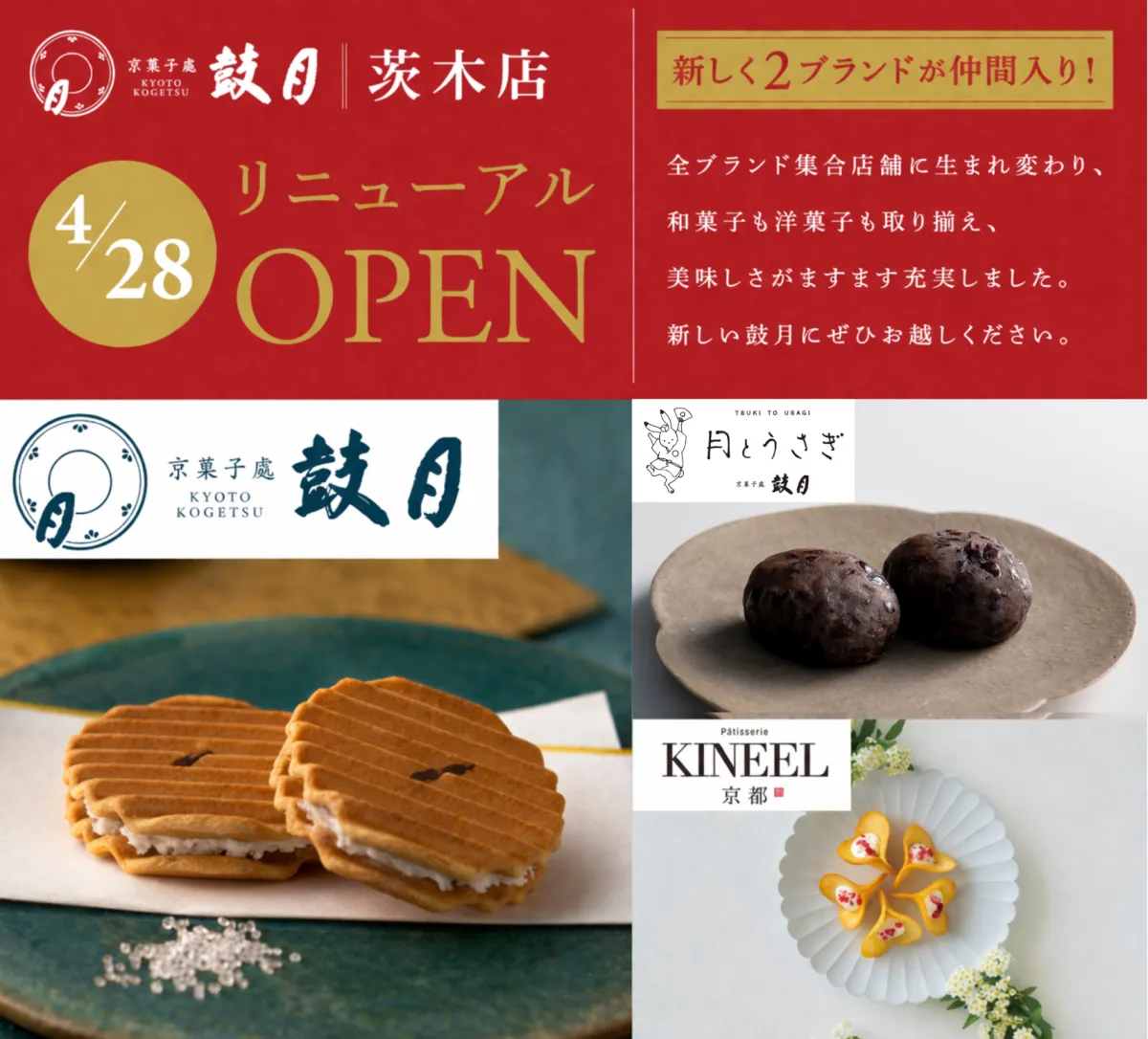 2026年4月28日、京菓子處鼓月の茨木店が新たに生まれ変わることが決まりました。従来の和菓子の枠を超え、和生菓子ブランド「月とうさぎ」と洋菓子ブランド「Patisserie KINEEL 京都」の2つの新店舗を設けることで、さらに多彩なスイーツの世界を提供します。