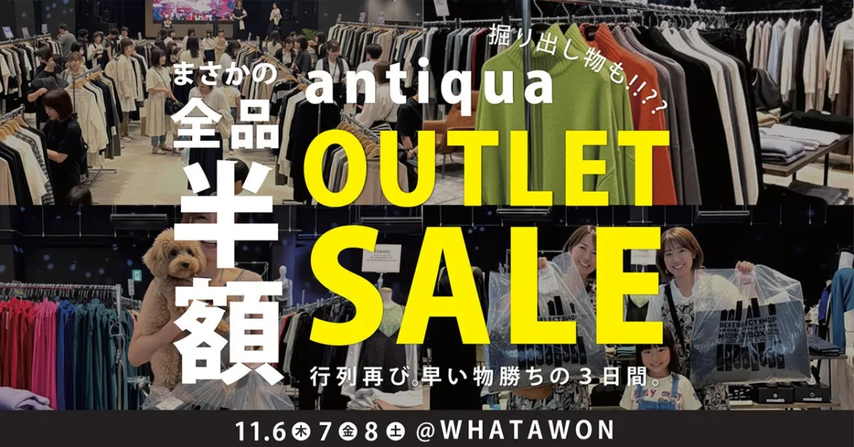 皆さん、注目のイベントがやってきます!2025年11月6日(木)から8日(土)の3日間、アウトレットセール『antiqua×WHATAWON OUTLET SALE』が開催されます。このセールでは、なんと全品が半額で提供されるという特別なチャンス。普段は手の届かないアイテムも、この機会にお得に手に入れられるチャンスです。
