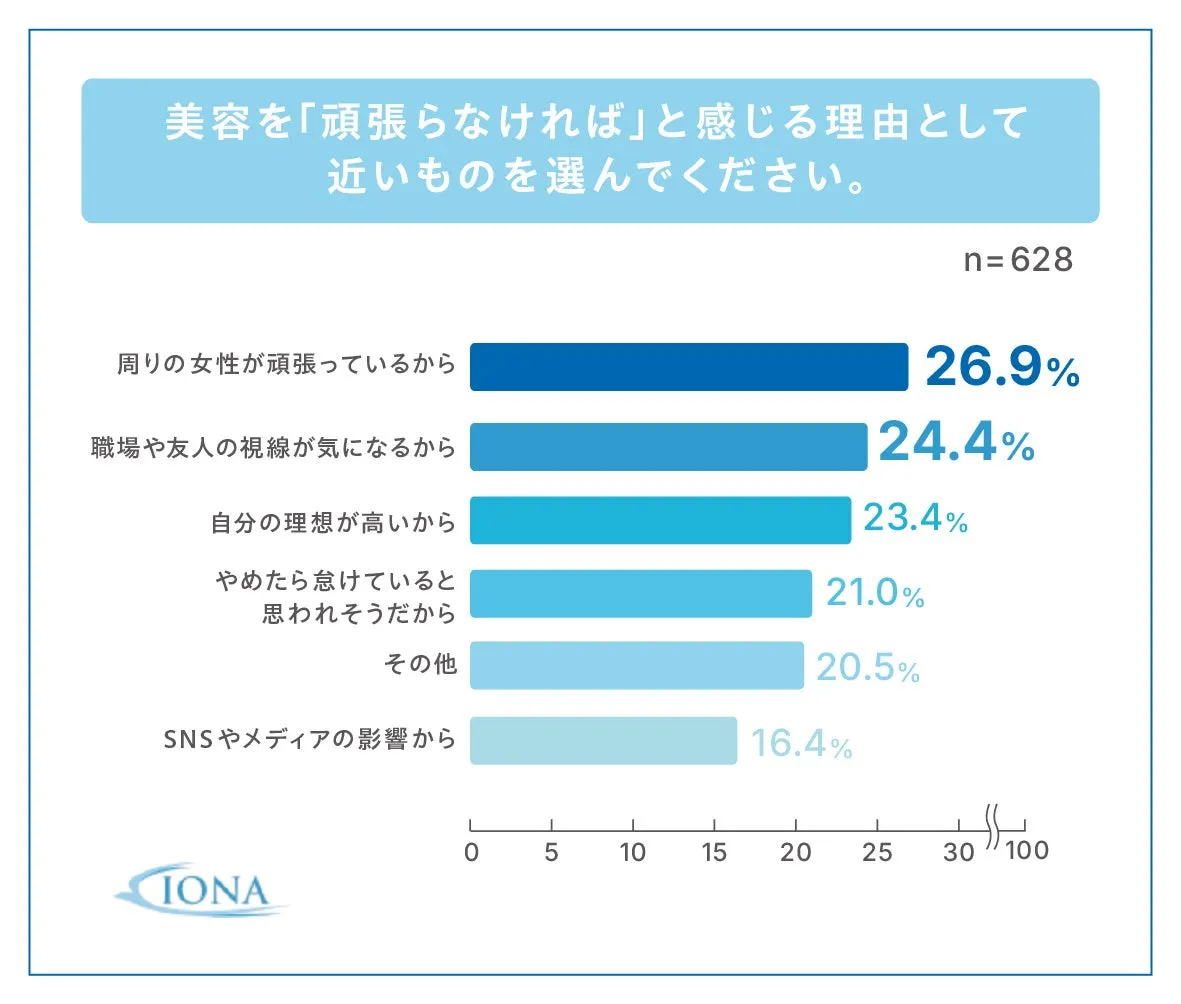 調査によると、女性たちが「美容を頑張らなければならない」と感じる理由には、周囲の頑張りや、SNS、職場、友人からのプレッシャーが挙げられています。特に周囲の美意識が高いことや、メディアが描く理想の自分像が彼女たちの自己評価に影響を及ぼし、「自分に満足できない」という感情を生み出しているようです。