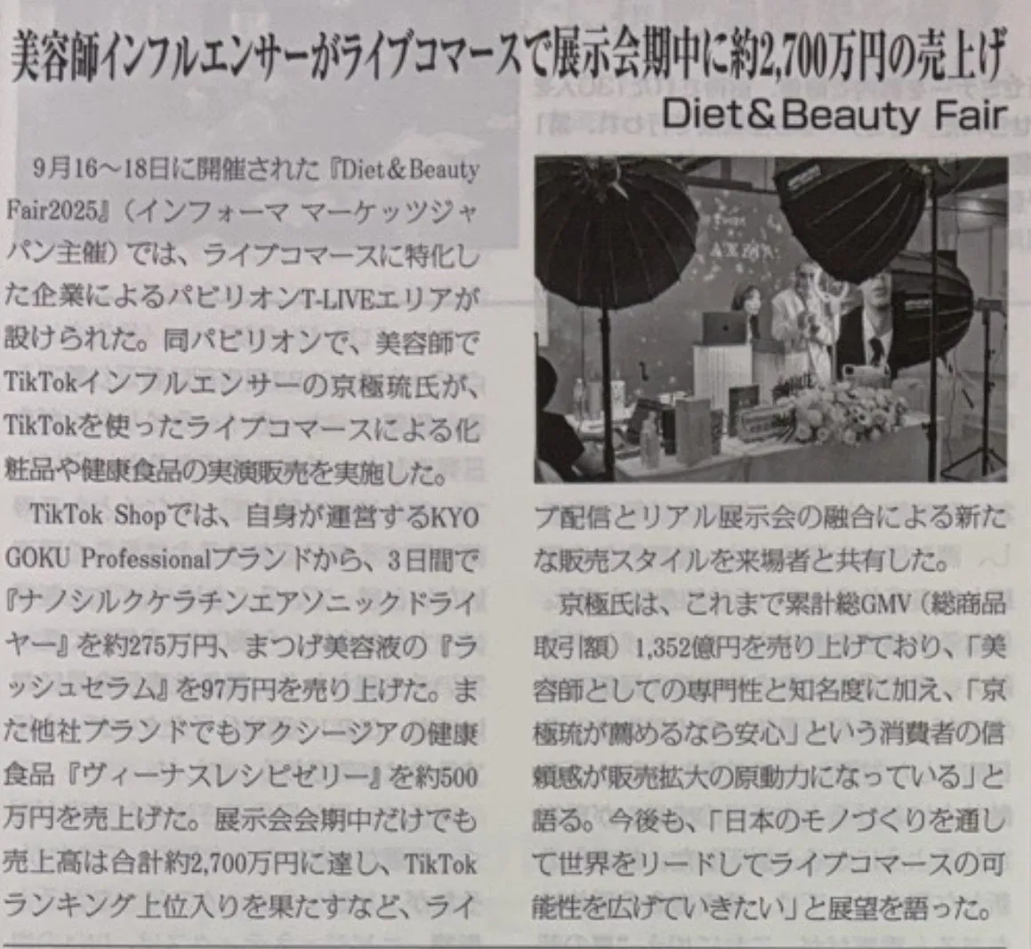 美容師であり、人気のTikTokインフルエンサーでもある京極琉は、現在注目を集めるライブコマースの最前線で活躍しています。特に、2025年9月に東京ビッグサイトで行われた「Diet & Beauty Fair 2025」では、彼の活動が『健康産業新聞』に取り上げられ、業界内外から注目されています。彼が登壇したライブコマース特化型パビリオン「T-LIVEエリア」では、3日間で約2,700万円の売上を達成したことが報じられました。