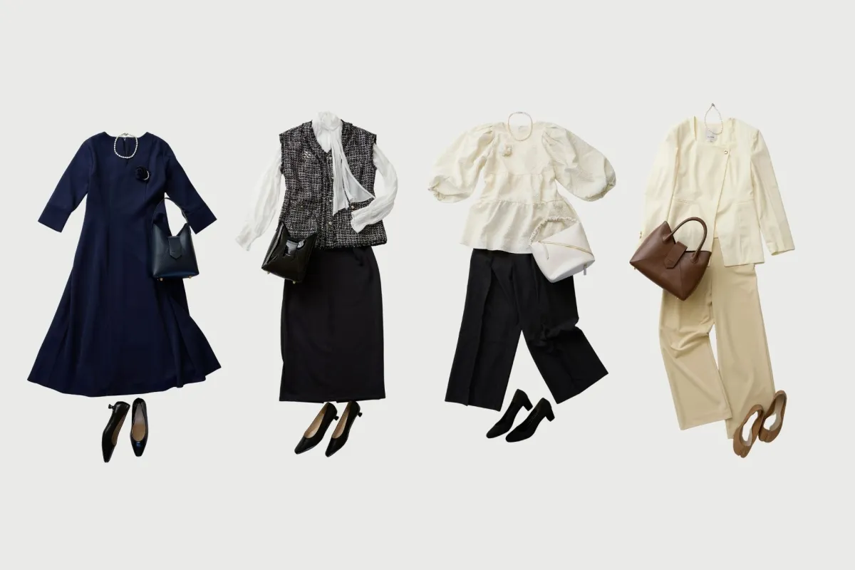 明るさを感じさせるホワイト系のスタイルで、始まりの季節にふさわしい軽やかな印象を演出します。大人らしさを忘れない巧妙なコーディネートで、特別な日を際立たせましょう。
