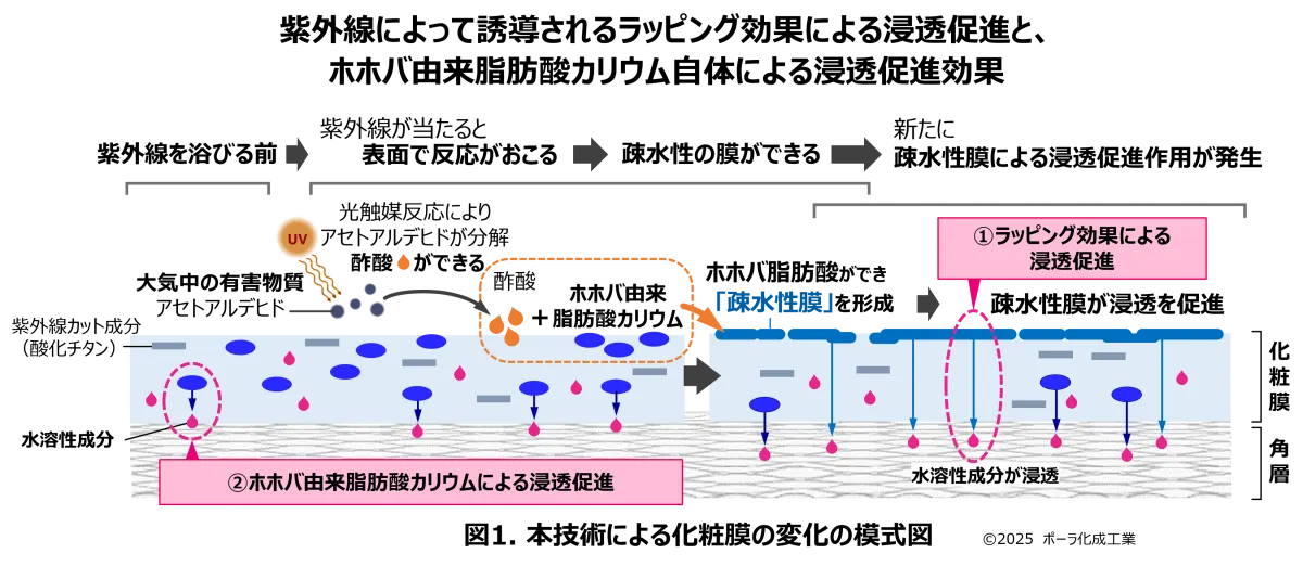 この新技術のコアには、「ホホバ由来脂肪酸カリウム」が含まれています。この成分は特性として、水に溶ける性質を持ちながら、pHが変わると疎水性に変化する特長があります。紫外線を受けることで膜を形成し、肌の水分を閉じ込める機能が強化されるのです。これはまさに、驚くべき進化です。