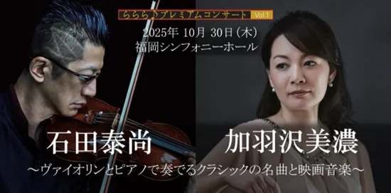 2025年10月30日、福岡シンフォニーホールにて、特別な音楽のひとときを提供する「ららら♪プレミアムコンサート Vol.1」が開催されます。この公演は、著名なヴァイオリニスト石田泰尚さんと、作曲家でピアニストの加羽沢美濃さんによる豪華デュオコンサートで、クラシックの名曲や映画音楽が奏でられます。