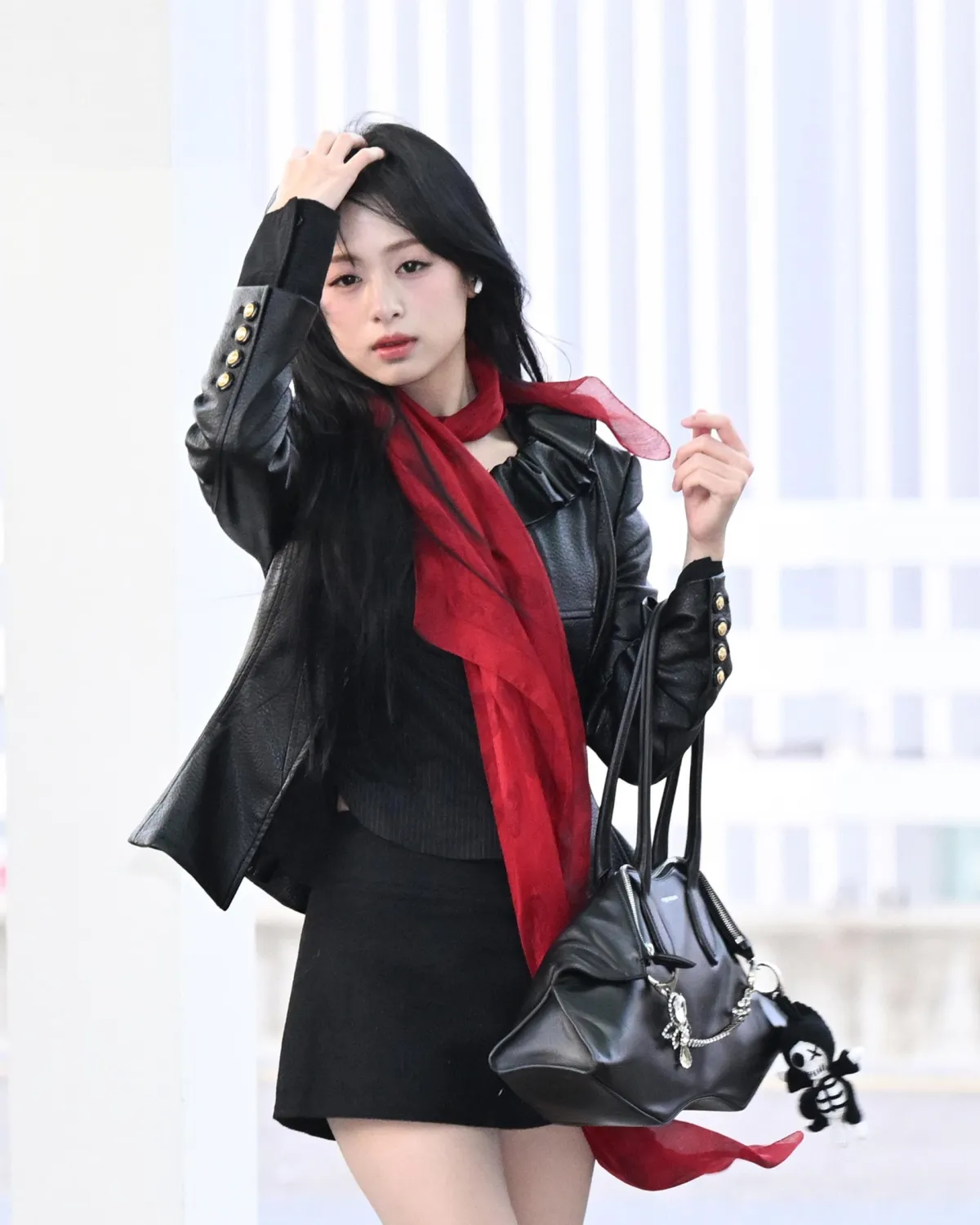 アヒョンは、2026年春夏プレコレクションから選んだアイテムで、ブラックレザーの「マンタ バッグ」を持ち、シャンデリア チェーン チャームとドール チャームをアクセサリーとして添えています。特に、レッドのシルクシフォン スカル スカーフは彼女の個性を引き立て、視線を集める要素になっています。ブラックとレッドのコントラストが美しく、シックでありながらも少しエッジの効いた印象を与えています。