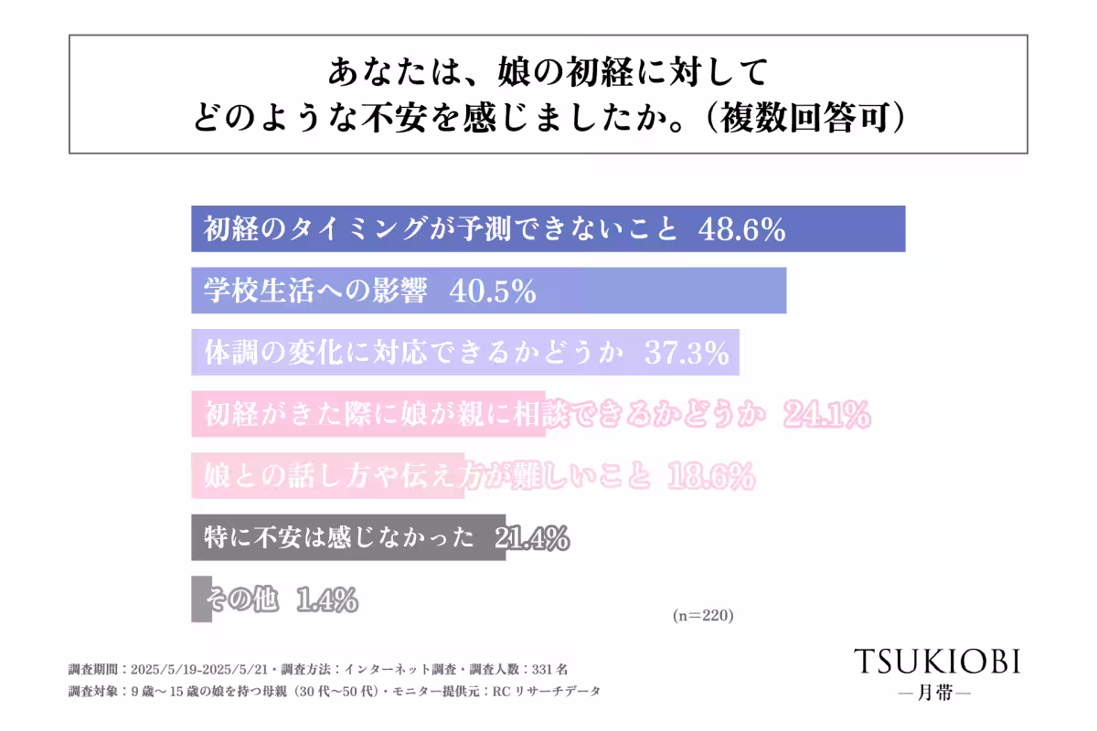興味深いことに、母親たちが感じている初経に対する不安の上位3項目は、1位が「初経のタイミングを予測できないこと」(48.6%)、2位が「学校生活への影響」(40.5%)、3位が「体調の変化にどう対応していいかわからないこと」(37.3%)です。このデータから、母親たちが娘の初経に非常に敏感であり、さまざまな状況で母親自身がサポートしなければならない重圧を感じていることがわかります。