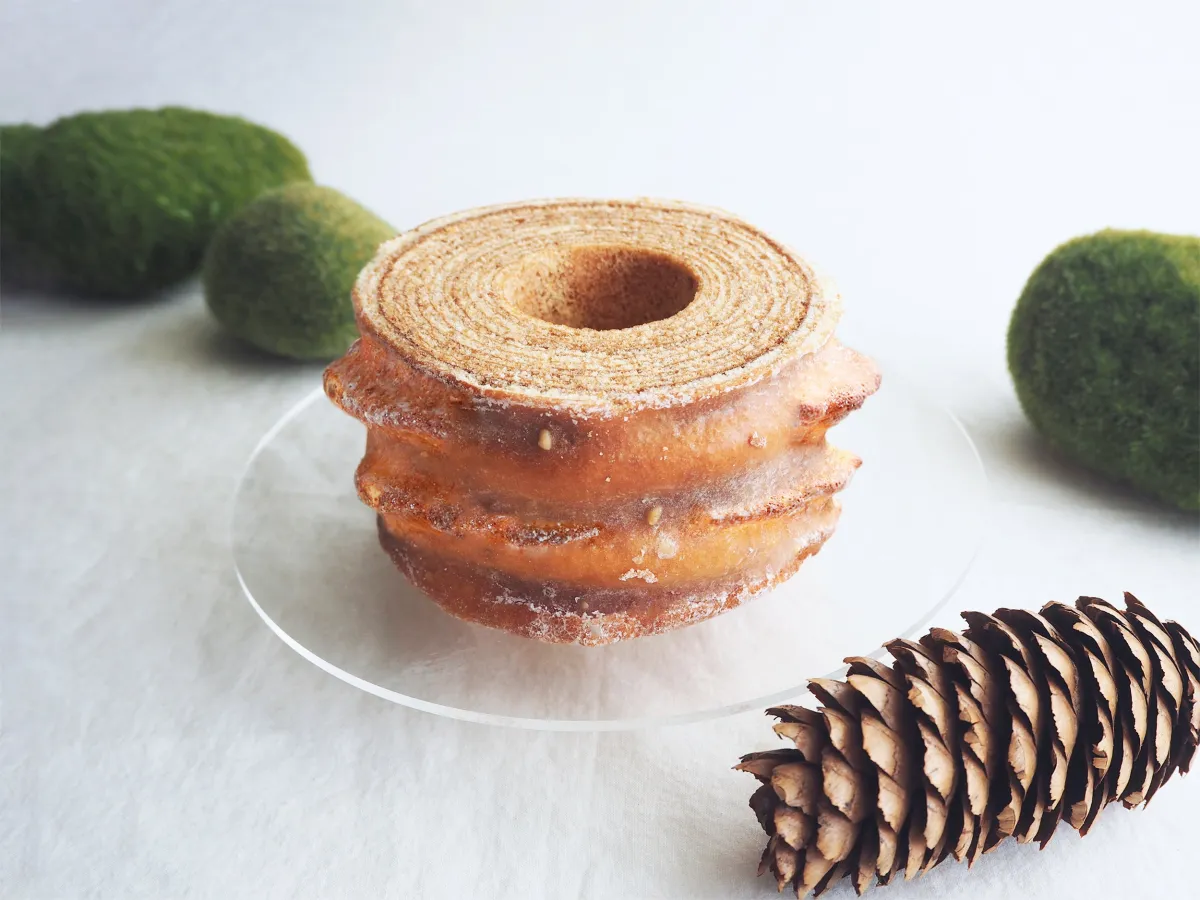 松の実を贅沢に使用しています。外側は香ばしいアーモンドパウダーと松の実が織りなす風味を十分に活かし、ヘルシーで食べやすい仕上がりに。広島産の卵とバターを使うことで、リッチで濃厚な味わいを楽しむことができます。特にハードバームクーヘンの外側はカリッと香ばしく、中はもっちりとした弾力を感じさせ、まるで盆栽の木肌を思わせるような食感を実現しています。