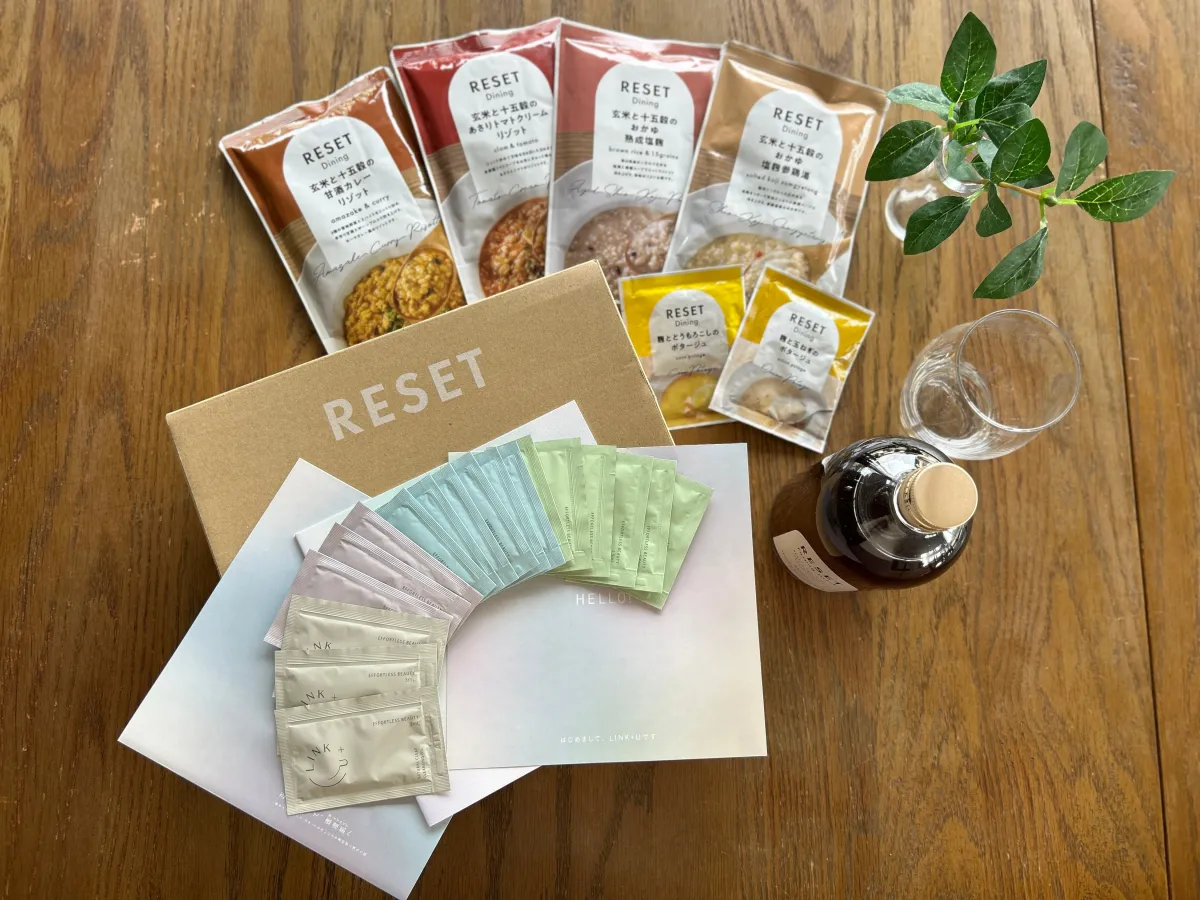 RESETの「FASTING BOX」は、酵素ドリンクや麹ポタージュなどが詰め込まれた本格的な5日間プログラムです。購入すると、ファスティングを行いながらも肌を整えることができるLINK+Uの3日間お試しセットが同梱されます。