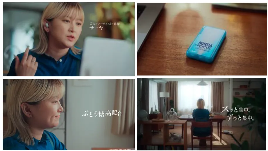 『ミンティア+FOCUS クリアラムネ』は、「集中、スッとつづく」というコンセプトのもと開発された大粒タイプのタブレット。忙しい日常の中で、どこでも手軽に集中力を保つことができる商品です。サーヤさんが一粒のタブレットを口にし、仕事に集中する姿をドキュメンタリー風に描いており、普段の生活に寄り添った内容が新鮮です。