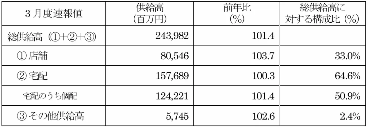 日本生活協同組合連合会(日本生協連)から、全国の66主要地域生協の2026年3月度における供給高(売上高)の速報が発表されました。この報告によると、総供給高は前年同月比で101.4%となり、非常に力強い結果を示しています。