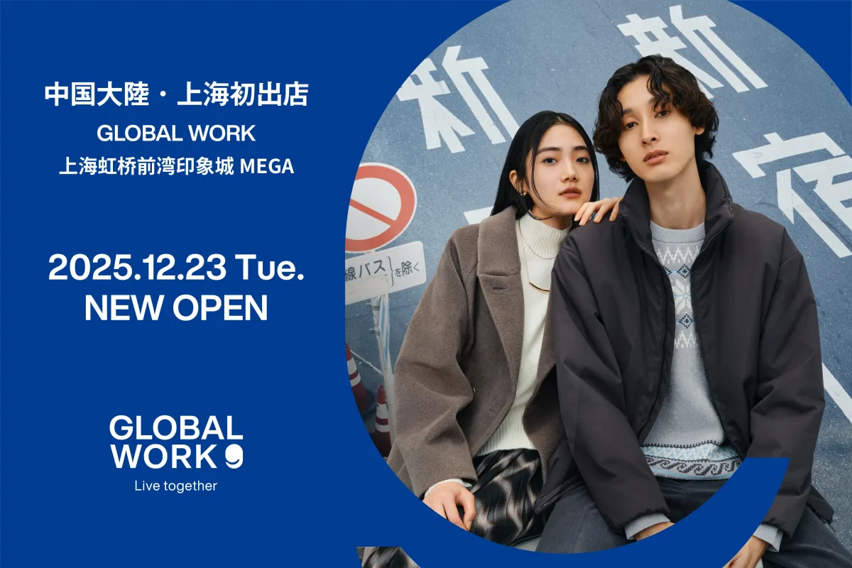 日本のカジュアルブランド「GLOBAL WORK」が、2025年12月23日(火)に中国大陸・上海で初の直営店「GLOBAL WORK上海虹桥前湾印象城MEGA店」をオープンサます。この新店舗のロケーションは、虹橋空港から近く、家族層に人気の高い前湾エリアの商業施設です。