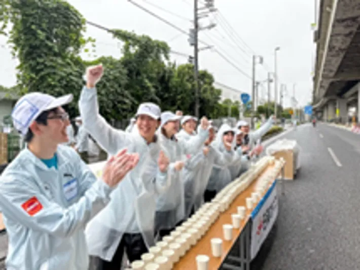 日清オイリオの横浜磯子事業場は大会コース沿いに位置し、社員もボランティアとして当日に参加します。給水ポイントでドリンクを渡す役割を担い、走る人たちを全力で応援するその姿勢は、多くのランナーにとって大きな励みになるでしょう。やる気満々の社員たちは、スポーツイベントにおいても日清オイリオの「植物のチカラ®」を実感する場面に恵まれます。