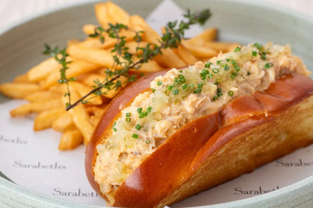 このサンドイッチは、甘みのあるクラブミートをたっぷりと使用し、セロリとエシャロットでバランスの取れたアクセントを加えています。その上に、コクのあるオランデーズソースとケチャップを合わせた特製ソースが、クラブの旨味を引き立てます。ピクルスとフレンチフライ付きで、見た目にも楽しい一品に仕上がっています。