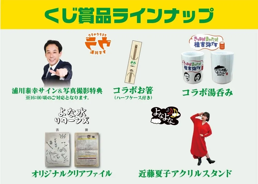 くじ引きに参加すると、浦川泰幸アナとの撮影特典や、『ウラのウラまで浦川です』コラボの「お箸」、桂吉弥とのコラボの「湯呑み」、さらには「よな水リターンズ」のクリアファイルなど、多彩な賞品に挑戦することができます。もちろんお一人様一回限りの参加となりますが、これだけの賞品は見逃せません!