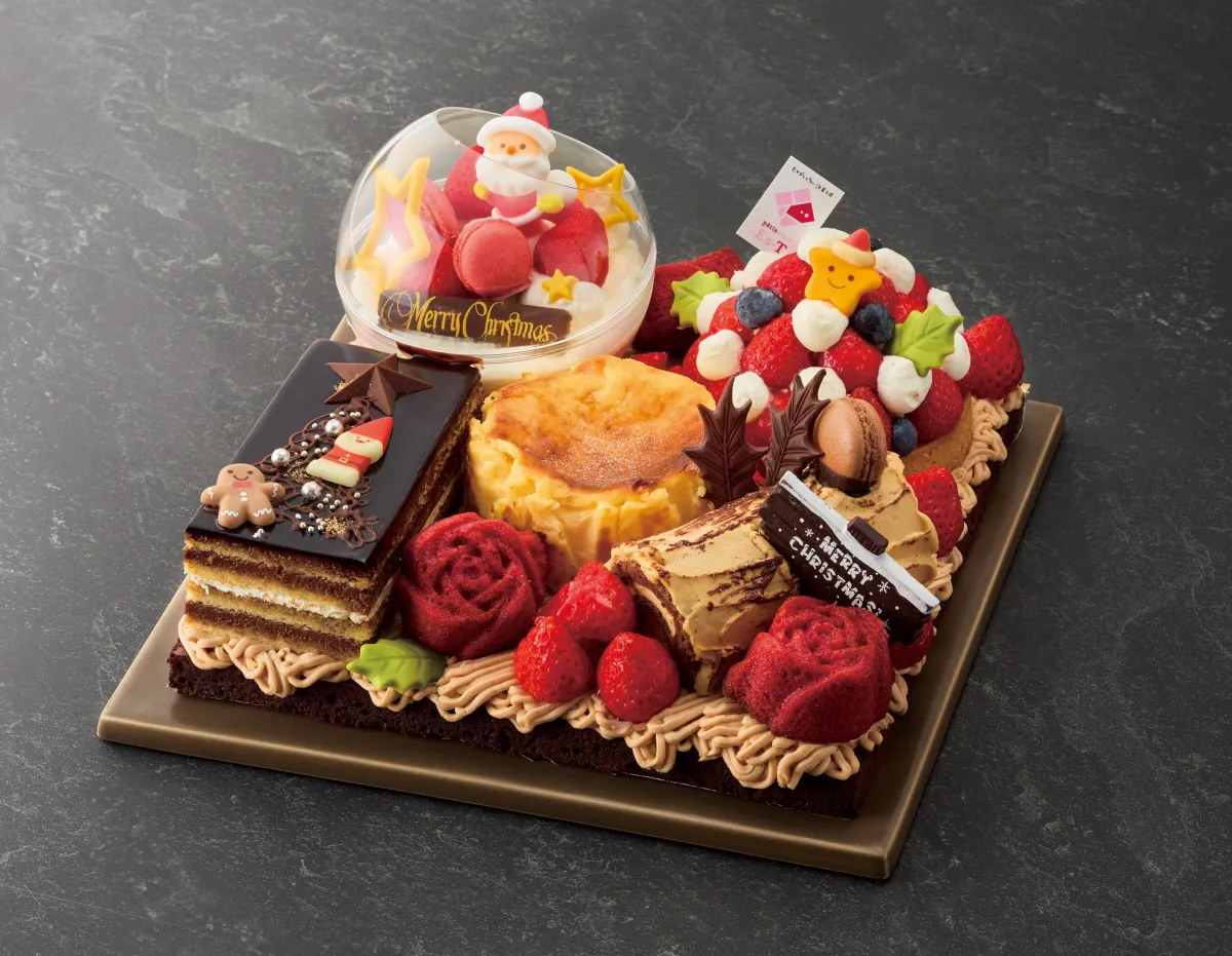 - 内容: スノードームショートケーキ、苺タルト、バスク風チーズケーキ、ガトーオペラ、ブッシュ・ド・ノエル、ガトーショコラ、モンブランクリーム