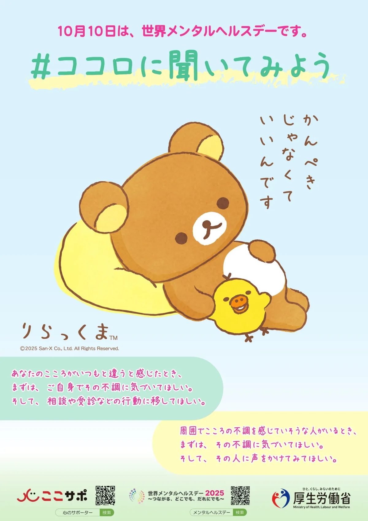 世界メンタルヘルスデー2025の応援サポーターに再び就任しました。この日、10月10日は、メンタルヘルスの重要性を広める国際的な日として認知されています。リラックマはここで、心の健康に寄り添う存在として、多くの人々にメッセージを届ける役割を携えています。
