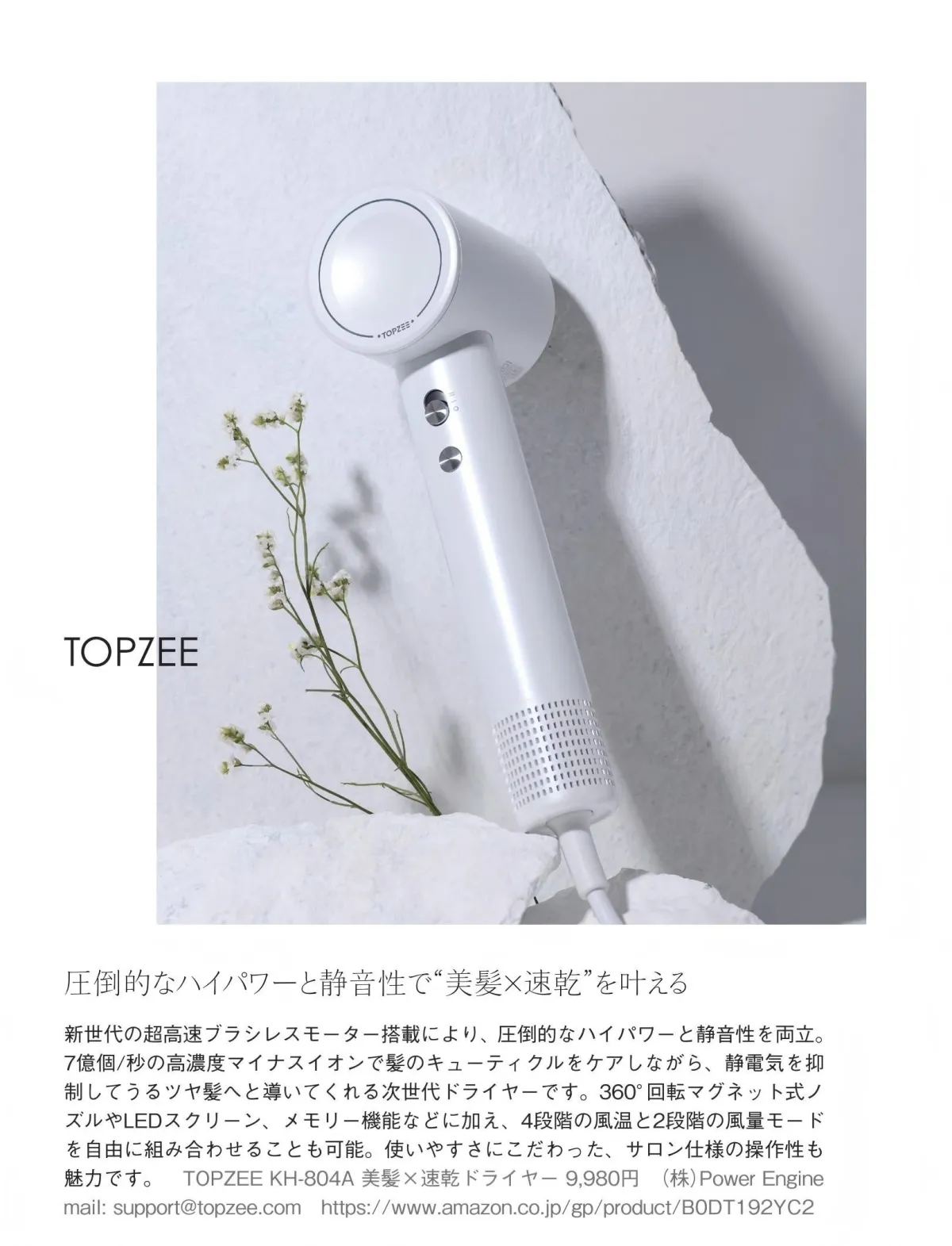 さらに、『美人百花』の特集には、速乾ドライヤーが登場。超高濃度のマイナスイオン技術が髪を守り、つややかな仕上がりを実現するアイテムとして、多くの女性たちに支持されました。このように、TOPZEEはファッションとライフスタイルを融合した製品を展開しています。